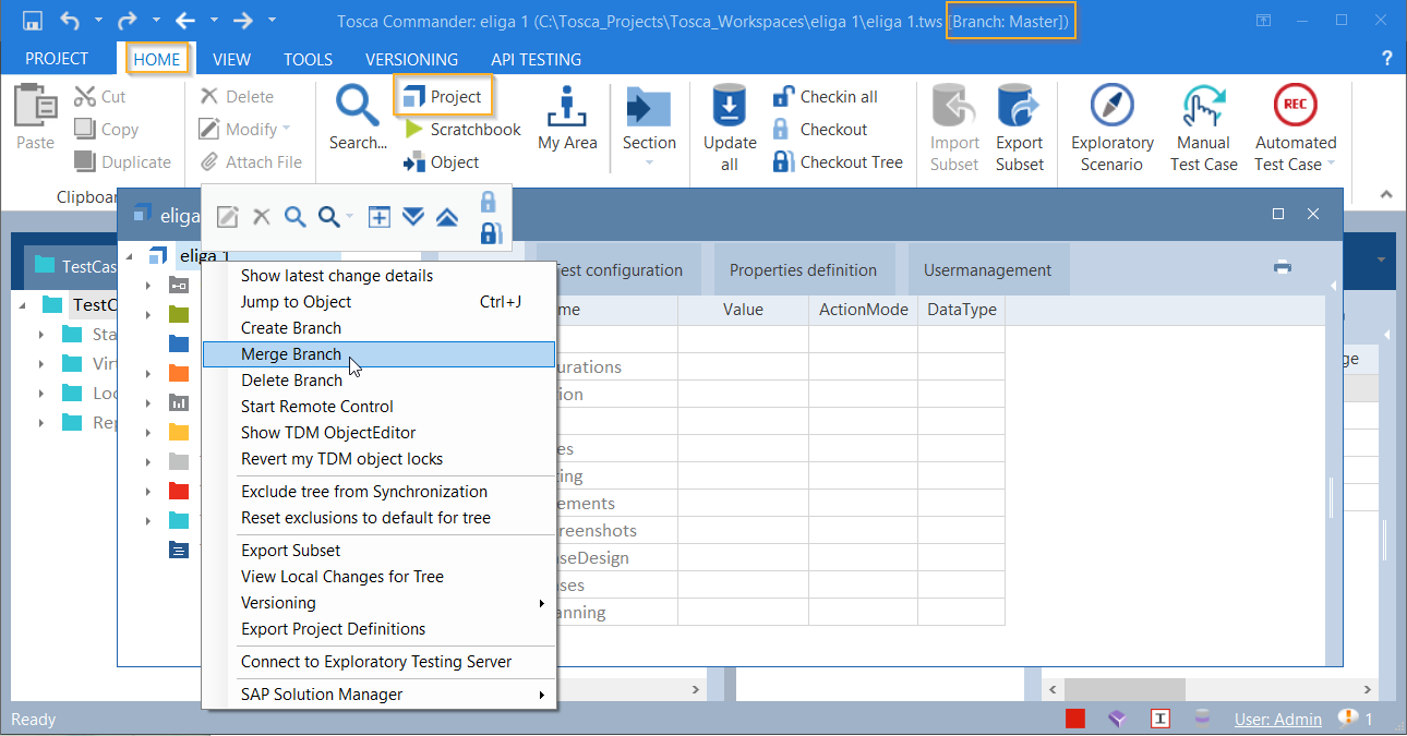 Benutzer mit Administratorrechten können Branches wieder in den Master-Branch in Tosca einbinden, um Änderungen von einer Version in eine andere zu übernehmen, ohne die Arbeit manuell wiederholen zu müssen.