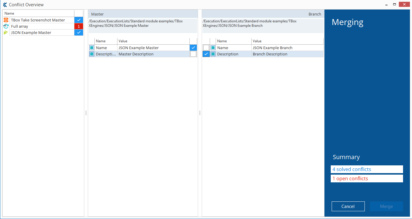 Ein Konflikt entsteht, wenn Sie einen Branch wieder in den Master-Branch zurückführen, aber unterschiedliche Änderungen am gleichen Objekt im Master und im Branch vorgenommen haben. In diesem Fall müssen Sie Tosca Commander mitteilen, welche Änderung er annehmen soll, um den Konflikt zu lösen.