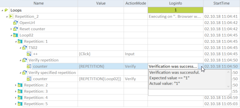 Schaltfläche mit einfachem Zähler Im ersten Testschritt wird auf die ++ Schaltfläche geklickt. Die Aktion ist Input. Im nächsten Testschritt wird die aktuelle Wiederholung des übergeordneten Verzeichnisses überprüft. Die Aktion ist Verify. Im dritten Testschritt wird die aktuelle Wiederholung des Verzeichnisses Loop02 überprüft. Die Aktion ist Verify.