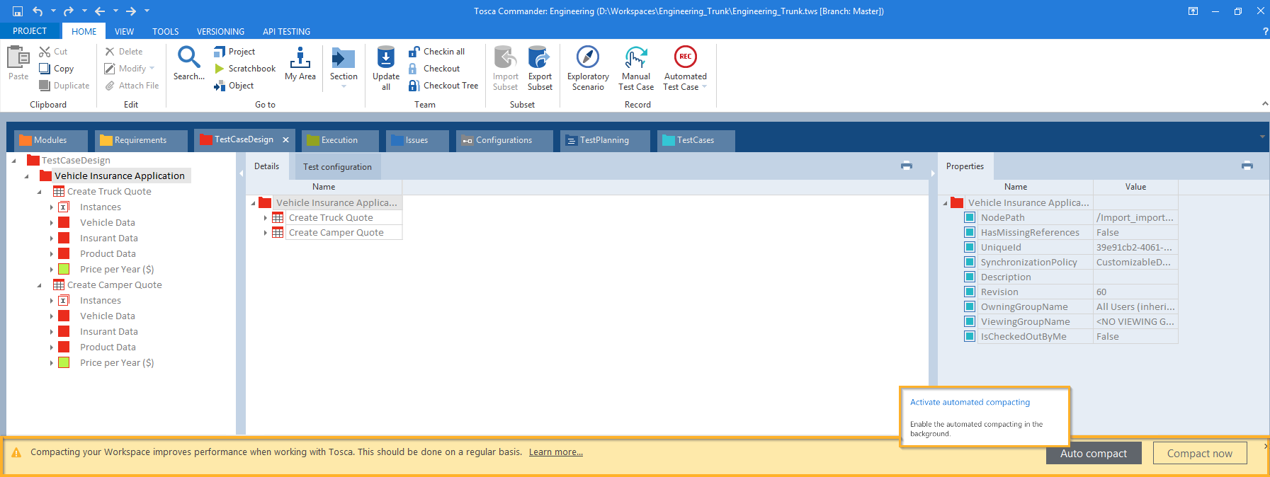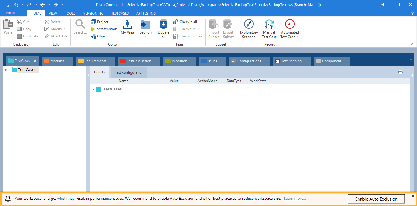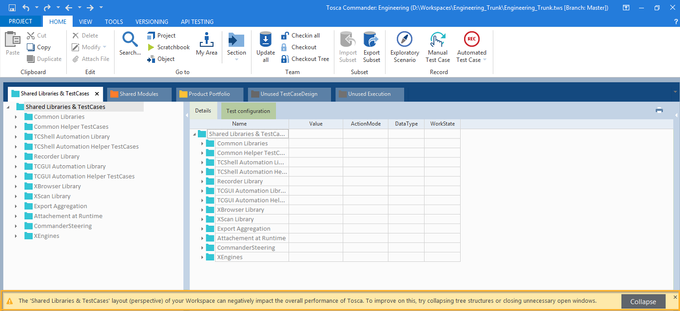 Der Tosca Commander bietet Hinweise zur Leistungssteigerung in großen Repositorys, um Ihren Arbeitsbereich zu optimieren.