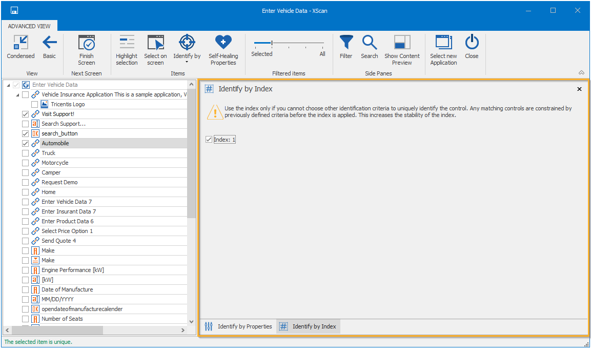 Um das Fenster Identify by Index in der Advanced View des Tosca XScan zu öffnen, klicken Sie auf die Schaltfläche Identify by und wählen Sie Index aus dem Aufklappmenü.