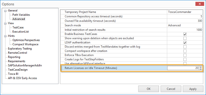 You can adjust your Options so that Tosca Commander automatically returns idle licenses after a specified amount of time.