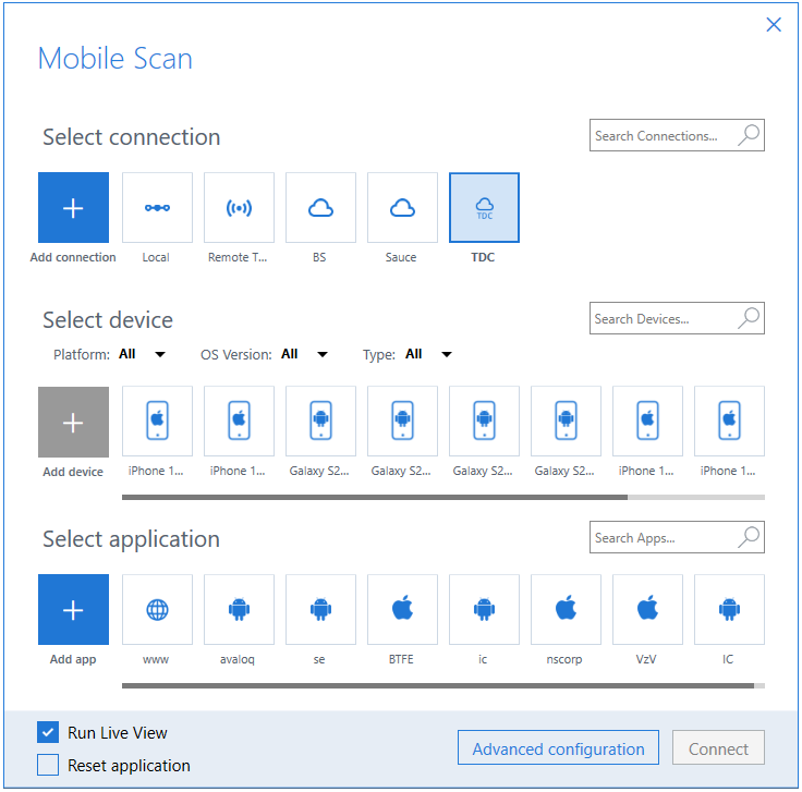 Fügen Sie im Abschnitt Select connection eine neue Verbindung hinzu oder wählen Sie die Verbindung aus, die Sie verwenden möchten, z. B. Local (TMA), Remote (TMA), Cloud (Appium) oder TDC.