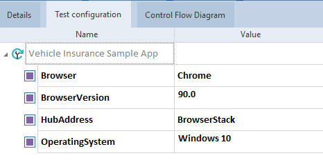 Erstellen Sie die Testkonfigurationsparameter Browser, BrowserVersion, HubAddress und OperatingSystem auf der Ebene des Testfalls, den Sie ausführen möchten.