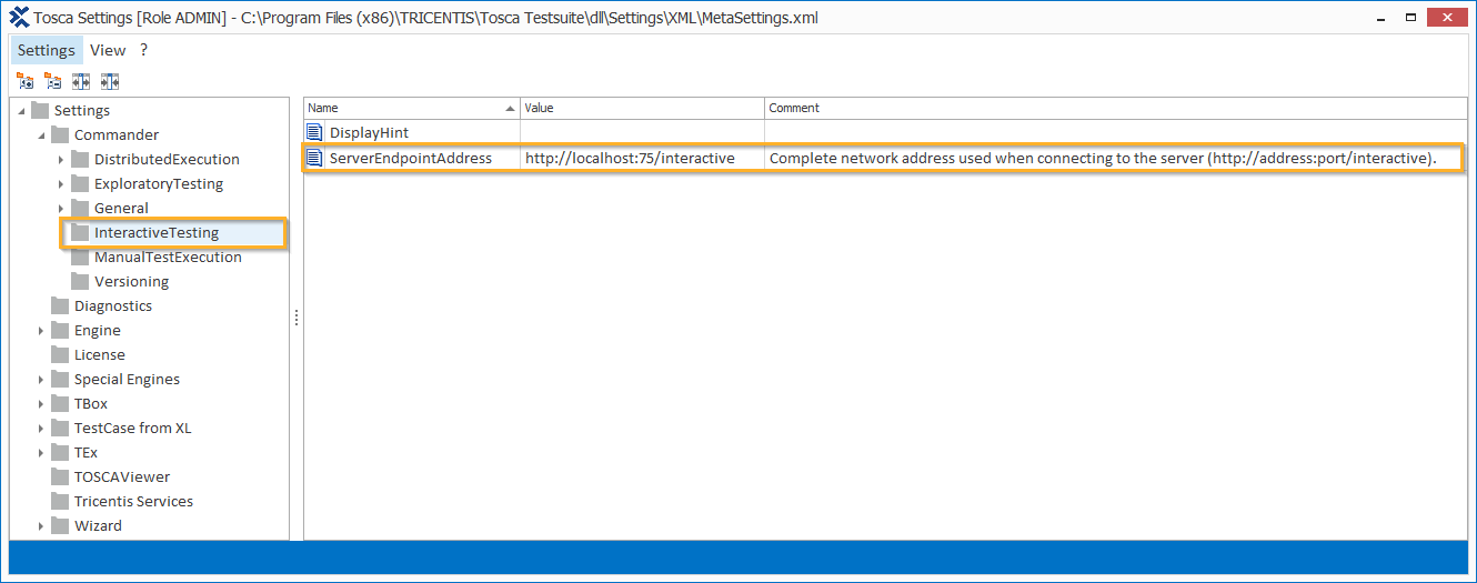 Navigieren Sie in der Baumansicht zu Settings->Commander->Interactive Testing.