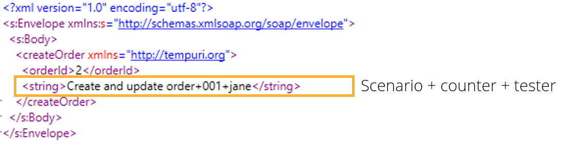 Das folgende Beispiel zeigt eine praktische Anwendung des gelben Algorithmus. In diesem Fall möchte ein Tester namens Jane einen Auftrag erstellen und die Information hinzufügen, dass sie den Test ausführt. Jane fügt eine Zeichenfolge zur ersten eingehenden Nachricht hinzu. Die Zeichenfolge enthält einen Zähler und Janes Namen.