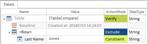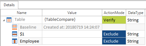 Wenn Sie bestimmte Zeilen oder Spalten vom Baseline-Vergleich ausschließen möchten, wählen Sie im Aufklappmenü der Spalte ActionMode des Table-Controls den Eintrag Exclude. Sie können Zeilen und Spalten innerhalb desselben Testschritts ausschließen.