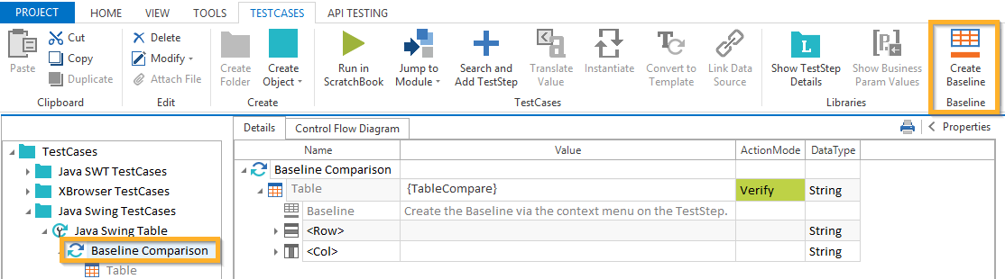 Tricentis Tosca erstellt das Baseline-Element und fügt es dem Table-Control hinzu. Die Spalte Value enthält das Erstellungsdatum und die Erstellungszeit.