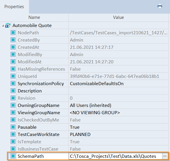 Um ein Excel-Tabellenblatt als Datenquelle zu verwenden, müssen Sie den Pfad zur Excel-Datei in der Testfalleigenschaft SchemaPath angeben. Geben Sie den Excel-Dateipfad im folgenden Format an:
