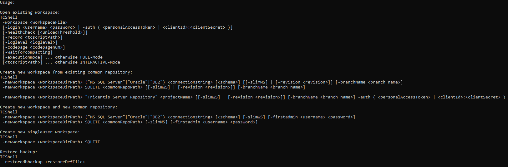 Sie können die Datei TCShell.exe verwenden, um neue MS SQL Server-, Oracle-, DB2- oder SQLite-Arbeitsbereiche zu erstellen. Ihr Parameter muss abhängig vom Repository-Typ bestimmte Werte enthalten.