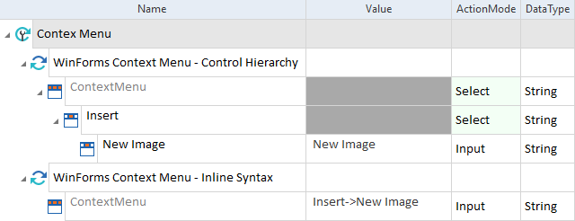 In this example, you select the entry Insert->New Image of a context menu which is currently open. It does so in two different ways: