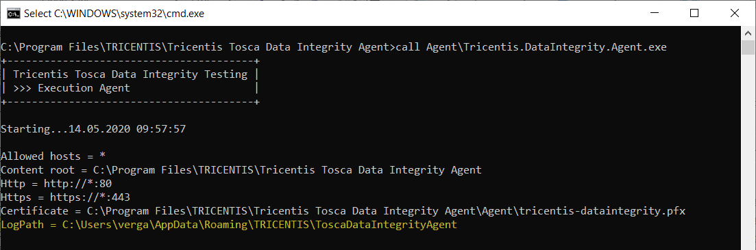 4. Um den Data Integrity Agent zu starten, führen Sie die Datei Tricentis.DataIntegrity.Agent.exe aus.
