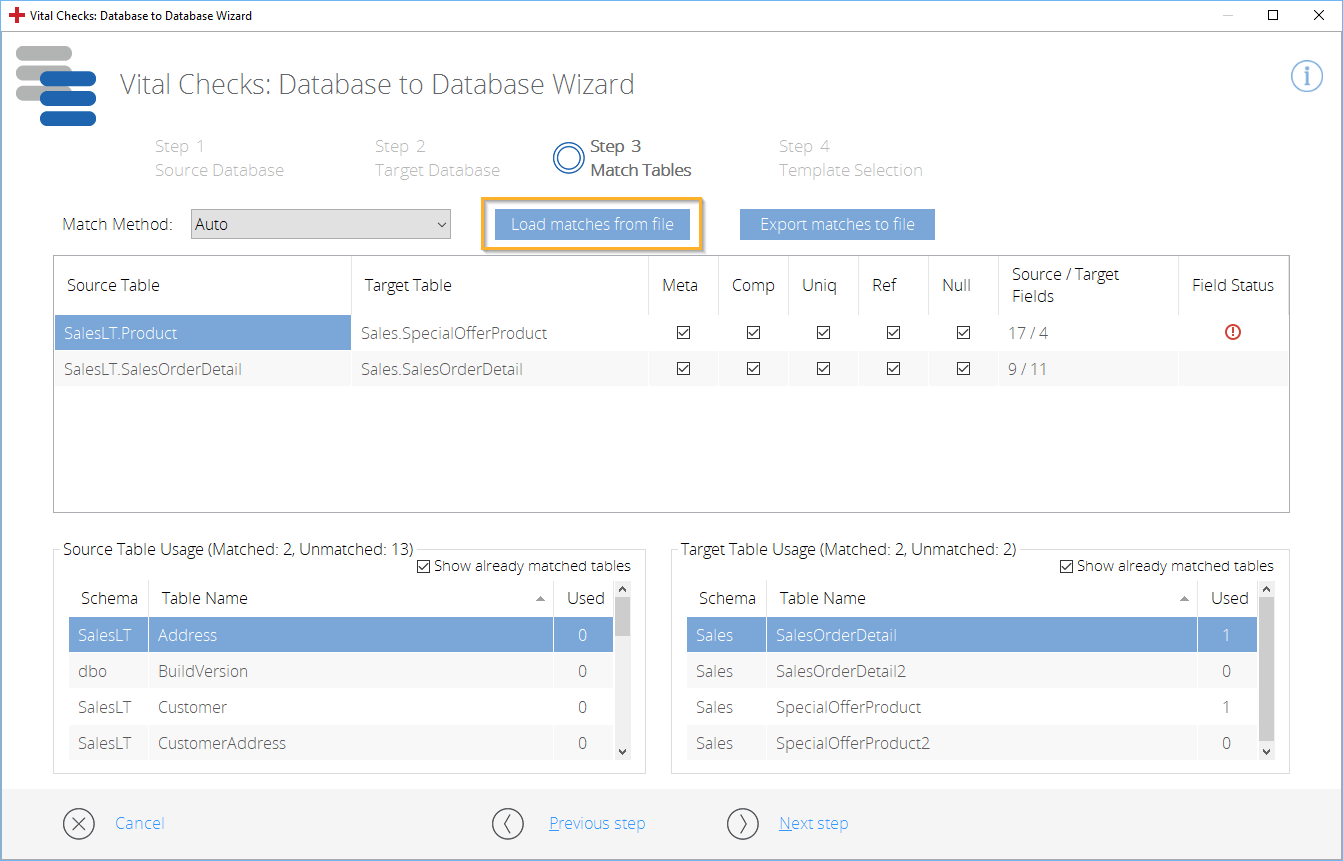 Wenn Sie Match Method manuell auf Auto zurücksetzen, kehrt der Wizard zum automatischen Abgleich zurück und ersetzt die Abgleiche aus der geladenen Datei durch die automatischen.