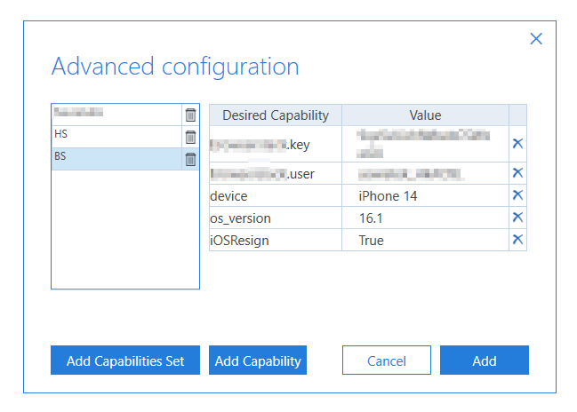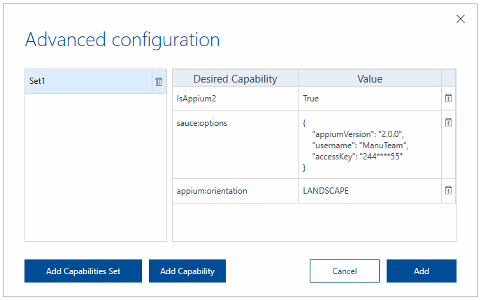 Wählen Sie Add Capabilities Set aus. Sie können einen oder mehrere Capabilities Sets definieren.