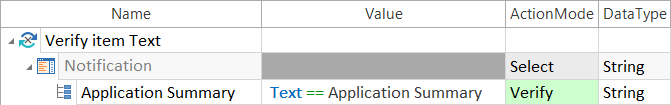 In diesem Beispiel wird der Text der Benachrichtigung Application Summary verifiziert.