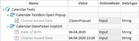 In diesem Beispiel wird im ersten Testschritt ein Popup-Fenster geöffnet (Calendar Control). Im nächsten Testschritt sind die Eingabe-Werte definiert.