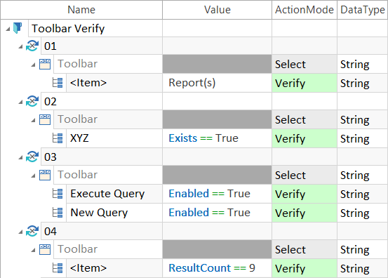 Testschritt 01 überprüft, ob der Wert xyt im Menü vorhanden ist. Testschritt 02 überprüft, ob der Menüeintrag Navigate->First Record ausgewählt werden kann. Testschritt 03 überprüft, ob im Menü View 10 Einträge vorhanden sind. Testschritt 04 überprüft, ob der Menüeintrag View->Site Map einen Eintrag mit dem Wert test besitzt.