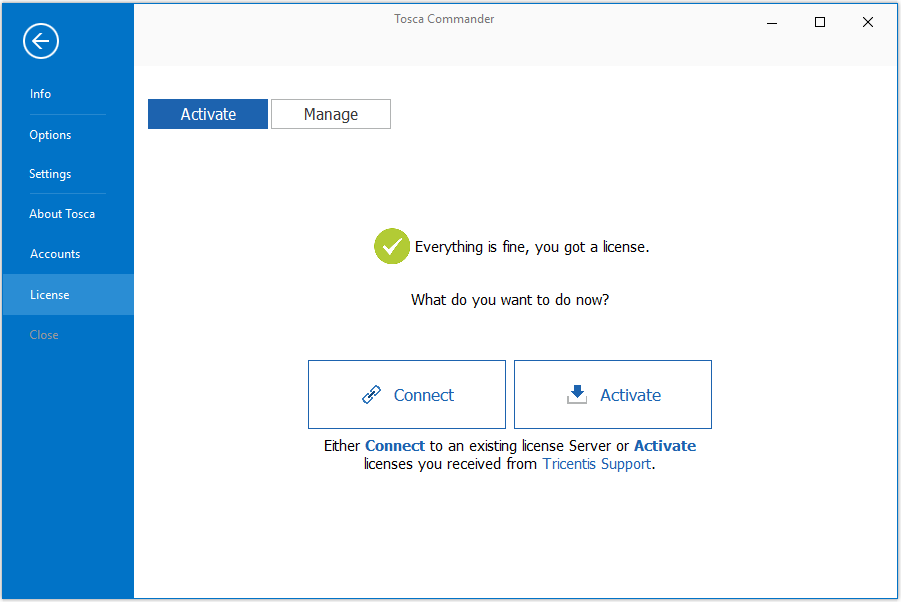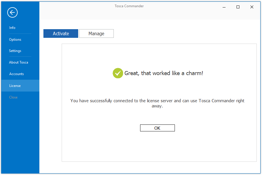 Klicken Sie nach erfolgreichem Verbindungsaufbau auf OK oder warten Sie einen Moment, bis das System Sie automatisch zur Tricentis Tosca Commander-Startseite weiterleitet.