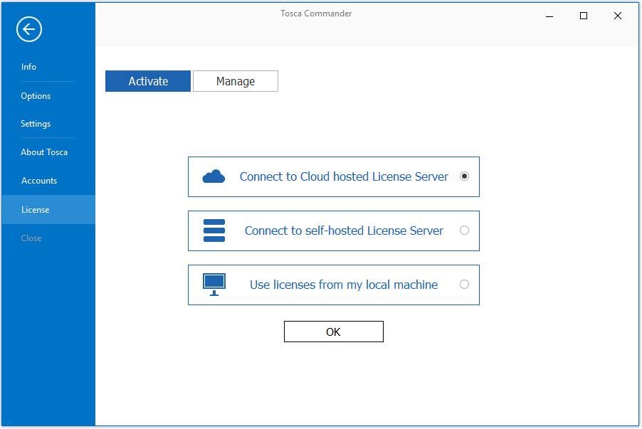 Selektieren Sie Connect to Cloud hosted License Server und klicken Sie auf OK.