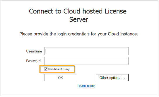 Wenn Sie einen Proxy-Server verwenden, wird auf dem Anmeldebildschirm auch das Kontrollkästchen Use default proxy angezeigt. Aktivieren Sie dieses Kontrollkästchen.