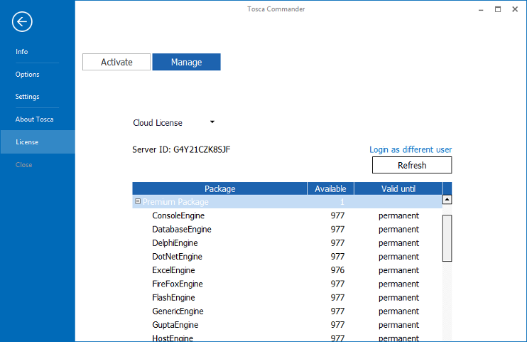 Der Reiter Manage zeigt eine Liste der verfügbaren Lizenzpakete für die folgenden Lizenztypen:
