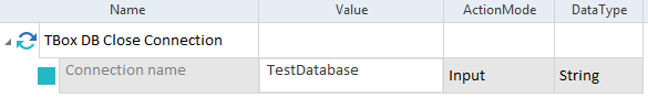 Alternativ können Sie die Verbindung mit dem Modul TBox DB Close Connection manuell beenden. In diesem Fall löscht die Database Engine 3.0 auch die Ressource, die Sie beim Öffnen einer Verbindung angelegt haben.