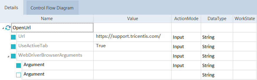 In diesem Beispiel öffnen Sie die URL https://support.tricentis.com. Wenn bereits ein Browserfenster geöffnet ist, öffnet der Tosca Commander die Seite auf der aktiven Registerkarte dieses Fensters. Sie übergeben keine Befehlszeilenargumente.