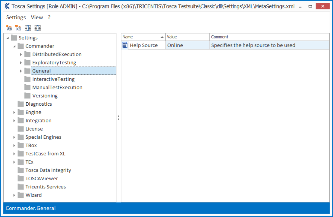 Im Menü View können Sie die Ansicht des Dialogs Settings von Tosca konfigurieren.