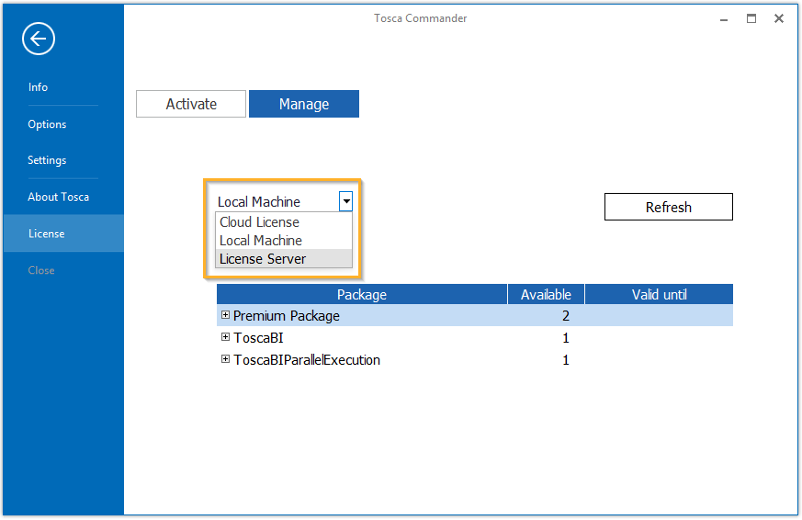 The system automatically directs you to the Manage tab, where you can view a list of available licenses on your local machine.