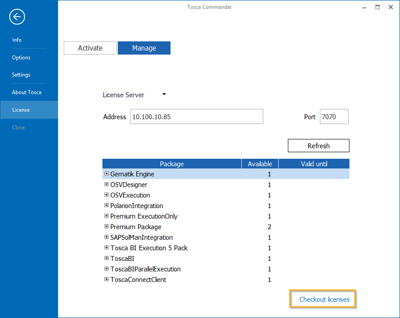If you checked out your licenses from an on-premise license server, the screen shows Address and Port of the license server.