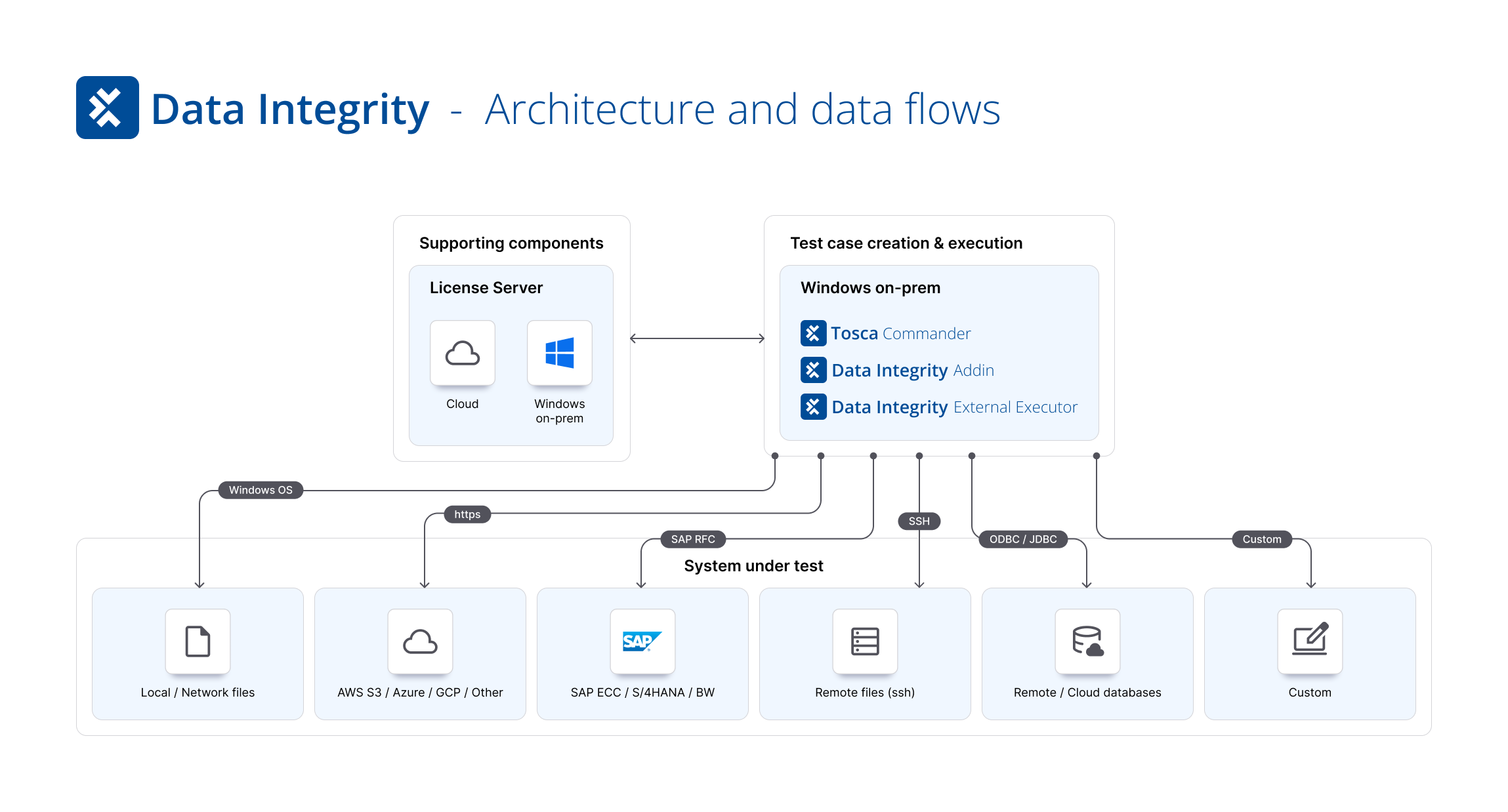 Dieses Diagramm zeigt die grundlegende Architektur von Tricentis Data Integrity, wie es sich mit Datenbanken verbindet und welche Ports es für die Kommunikation benötigt.