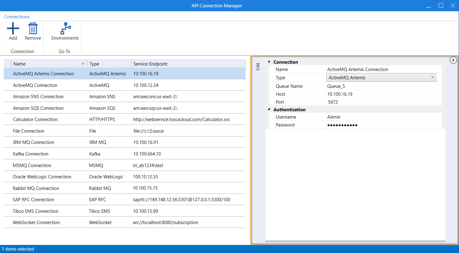 Sie können eine ActiveMQ Artemis-Verbindung im API Connection Manager konfigurieren.
