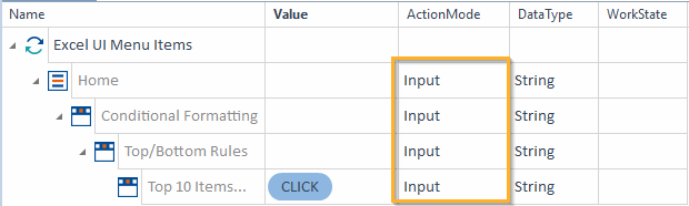 Wenn Sie Microsoft Excel-Menüpunkte steuern, verwenden Sie die Aktion Input für alle übergeordneten Menüpunkte. Im Gegensatz zu Rastern können Sie Excel UI-Menüpunkte nicht steuern, indem Sie sie auswählen.