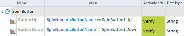 Ein Spin Button besteht aus zwei Komponenten: dem Aufwärtspfeil und dem Abwärtspfeil. Der XScan kann jede Komponente eines ActiveX Spin Button als einzelnen Button aufzeichnen. Sie können sie wie im Kapitel „Button“ beschrieben steuern.