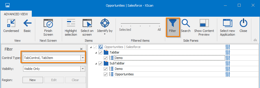In diesem Beispiel möchten Sie TabItems auf beiden Arten von Registerkartenleisten aufzeichnen. Filtern Sie dazu in der Advanced View des Tosca XScan nach TabItem-Controls.
