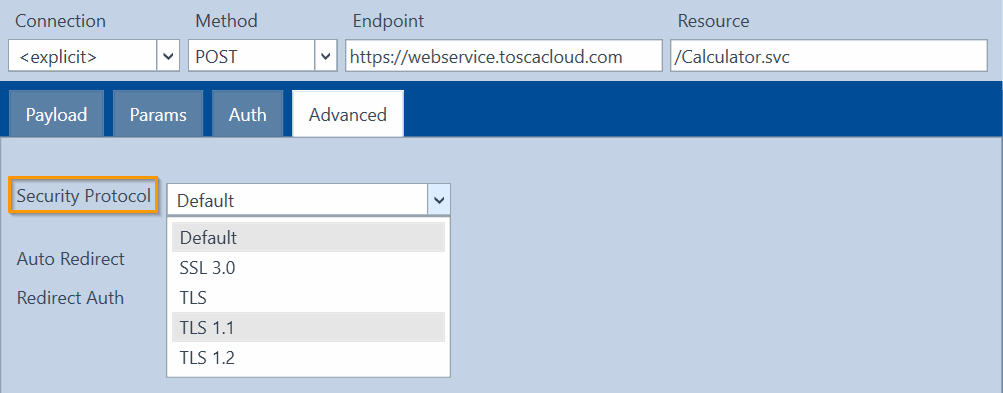 Der Tricentis Tosca API Scan kann beim Senden Ihrer Nachrichten ein bestimmtes Sicherheitsprotokoll verwenden.