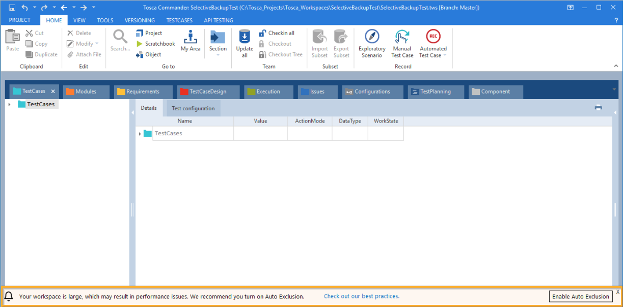 Die gelb hervorgehobenen Hinweise unten im Fenster sind Tipps, die wir zur Verbesserung der Leistung anbieten. Basierend auf Ihrer Umgebung schlägt der Tosca Commander durch diese Hinweise vor, Ihren Arbeitsbereich zu optimieren: