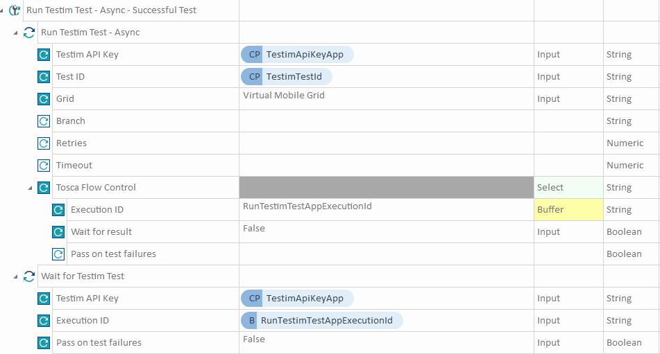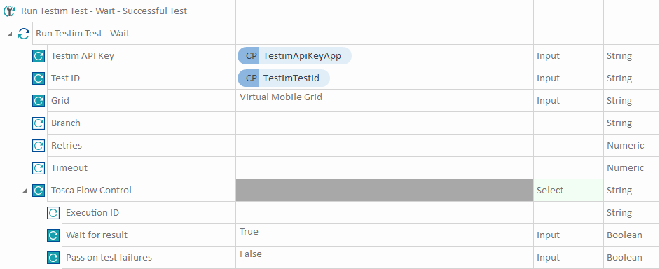 In diesem Beispiel möchten Sie einen bestimmten Testim-Test asynchron ausführen und auf das Testim-Ergebnis warten, nachdem Tosca seine verbleibenden Testschritte abgeschlossen hat. Dazu verwenden Sie die Module Run Testim Test und Wait for Testim Test. Um den Testim-Test asynchron auszuführen, konfigurieren Sie das Modul Run Testim Test wie folgt: