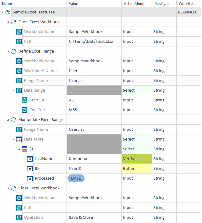 In this example, you steer data in an Excel file. The first TestStep opens the file test.xlsx, which is located at C:\Temp\Data. You assign the name SampleWorkbook to the file. In the second TestStep, you assign the name UserList to the data range that you want to steer. Additionally, you specify the following: