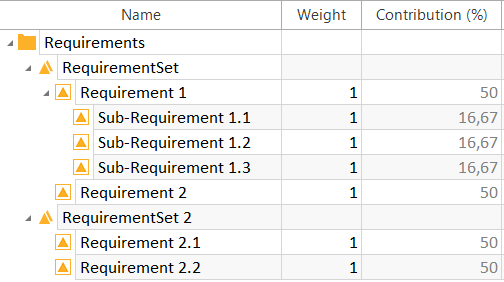 「 貢献度 (%) 」は、各要件が所属する要件セットにどの程度貢献しているかをパーセンテージで表したものです。この計算は、それぞれのRequirementの重みに基づいて行われます。Sub-Requirementは親Requirementを基準にして計算されます。