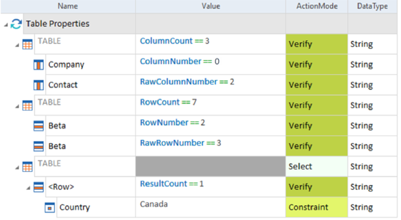 テーブル例 その後、「 Table Properties 」テストステップを作成し、すべてのテーブルプロパティを正しく検証します。