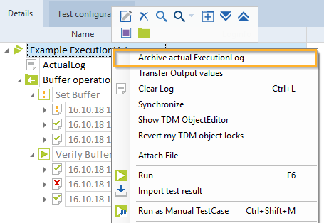 Tricentis Tosca はアーカイブログを作成し、ActualLogの下と実行エントリーに表示します。