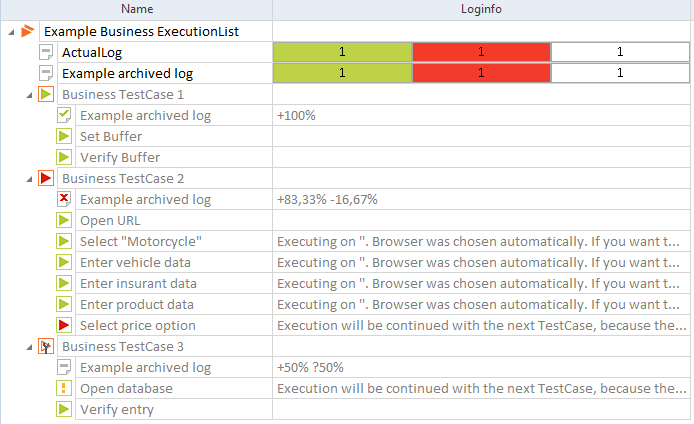 実行エントリーレベルの1つ以上のテストケースログです。これらのログには、実行エントリーが含まれます。実行エントリーを再度実行すると、 Tricentis Tosca によって新しいログが作成されます。