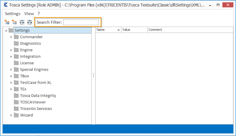 この設定により、ツールバーに検索フィールドが表示されます(see " 検索フィルター")。検索には、カテゴリ、設定、コレクション、 CollectionEntries に加えて、設定と CollectionEntries の値も含まれます(see chapter "設定の管理")。  |