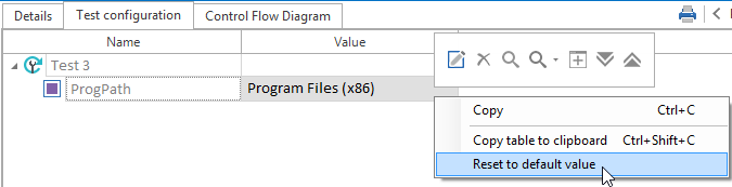 テストコンフィギュレーションパラメータをクリックし、コンテキストメニューから Reset to default value を選択します。