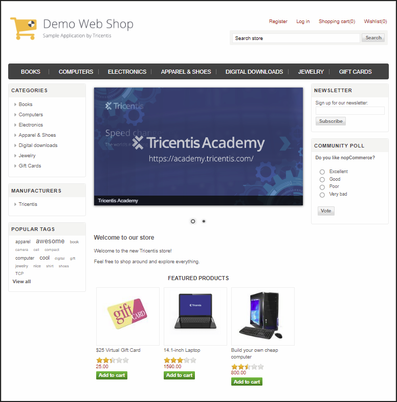 Werfen wir einen Blick auf den Demo-Web-Shop-Bildschirm. Hier können Sie separate Module für jedes Element erstellen: Kopfzeile, Fußzeile, Menüband, Kategorien, Hersteller, beliebte Tags, vorgestellte Produkte usw.