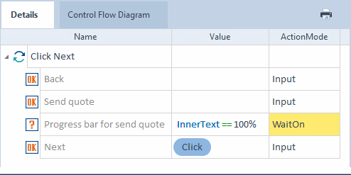 Fügen Sie dynamische Wartezeiten hinzu, sodass Tosca wartet, bis Ihre Applikation einen bestimmten Status erreicht hat. Dies kann der Fall sein, wenn beispielsweise ein Fortschrittsbalken 100 % erreichen muss, bevor die Schaltfläche Next aktiviert wird.