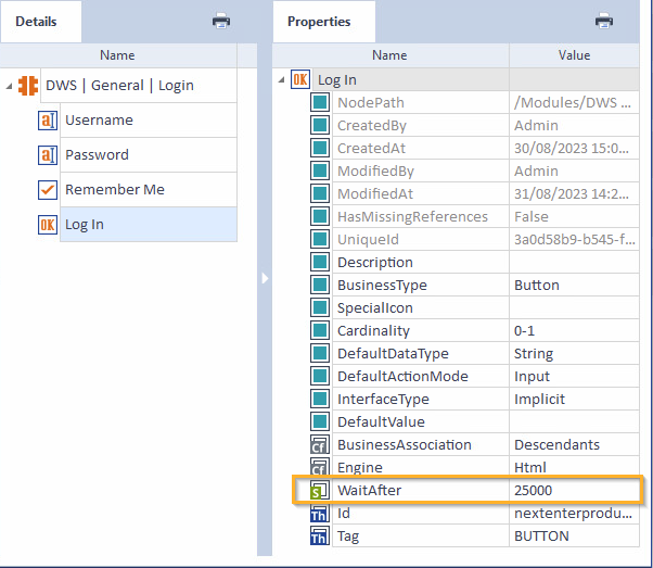 Steuerungsparameter WaitAfter für das Modulattribut Log In: nach Steuerung des Controls Log In immer 25 000 Millisekunden warten
