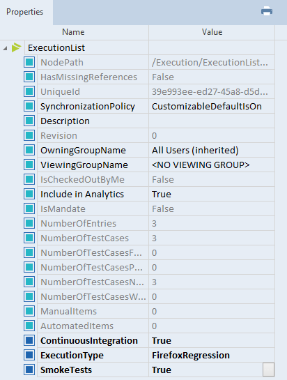 Setzen Sie im Bereich Properties jeder Ausführungsliste, die Tosca Continuous Integration-Tests enthält, den Eigenschaftswert unter Value auf True.