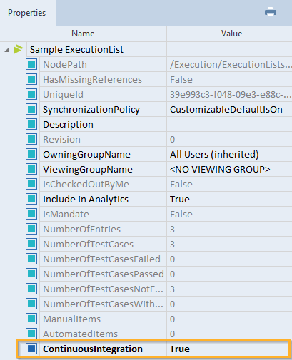 Eigenschaft ContinuousIntegration auf True gesetzt für Sample ExecutionList